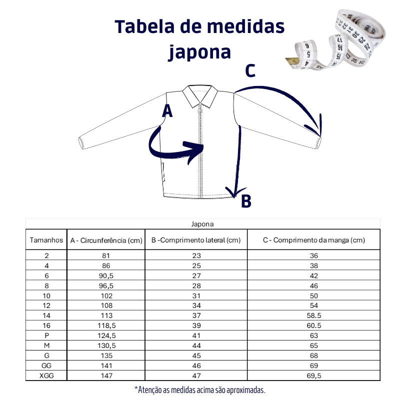 O japona é feita em tecido escovado e matelado, além do forro, possui bolsos laterais, capuz destacável e regulável. A peça não possui elasticidade, apresenta boa resistência, retenção do calor, baixo abarrotamento, rápida secagem.